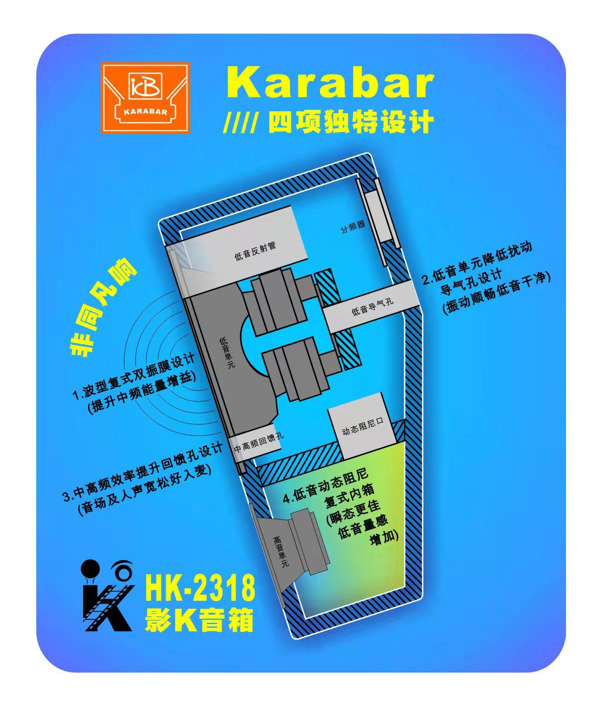 Karabar音箱运用BiPolar设计的特性,第一个将其运用于KTV音箱上的品牌。 Karabar音箱将其中两个中低音单元装于音箱后方,借由后墙反射音与前方两个中低音单元直接音耦合,使中低频量感及低频延伸获得提升且有更好的扩散,因此能呈现出很好的音场包围感及庞大的音场气势。 只要将音箱安装在离后墙约30CM以上到100CM以内,视空间状况取得适当安装距离,音场效果都会有明显改善。